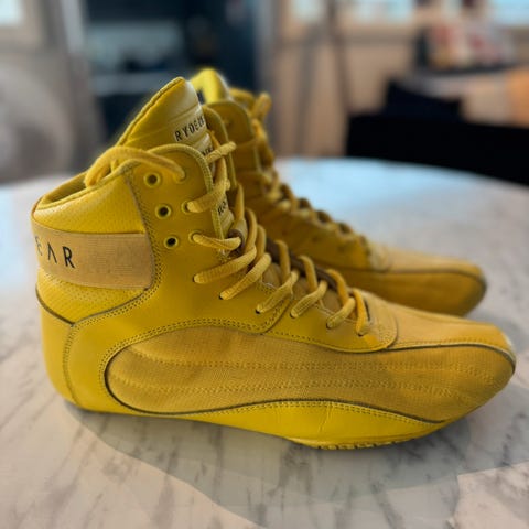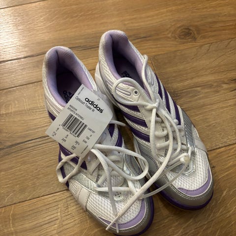 Skoene er svarte med hvite detaljer og har en gummisåle som ikke setter merker på gulvet.