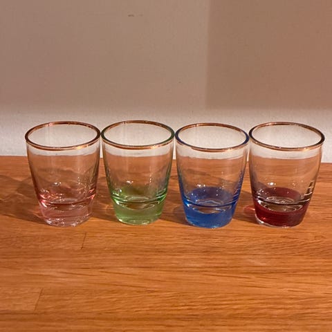 Karaffel og seks dramglass.