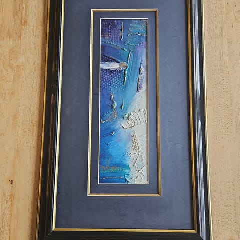 Lerretet har en liten skade som gjør at bildet buler litt ut på et punkt. Vanskelig å få frem på bildet.