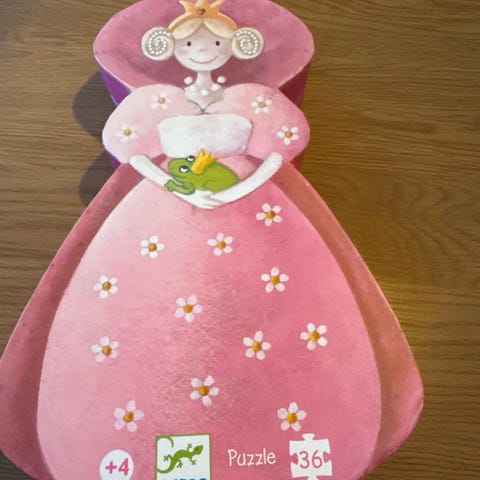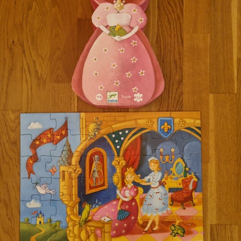 Djeco Fairy Shape Puzzle med 36 biter. Puslespillet har form som en fe med lilla kjole og vinger. Passer for barn som liker eventyr og fantasifulle motiver. Svært pent brukt, fremstår som nytt.