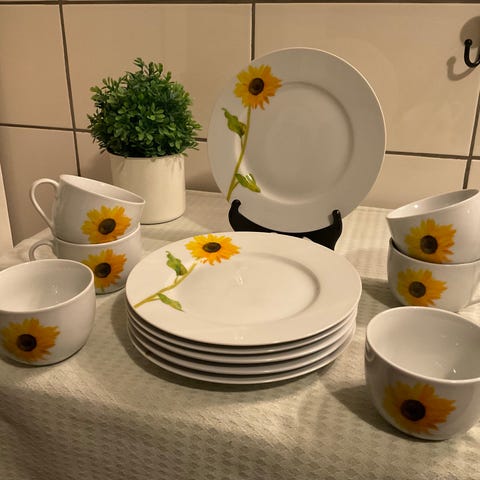 Vintage servise sett bestående av tallerkener, kopper, skåler og sukkerskål.