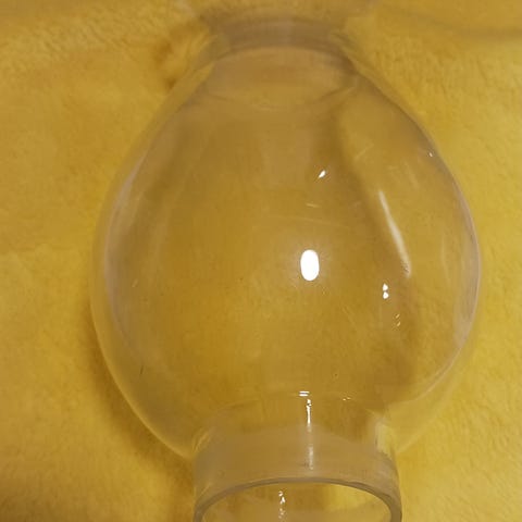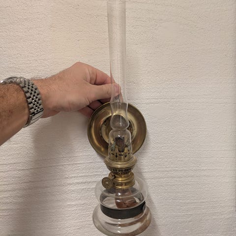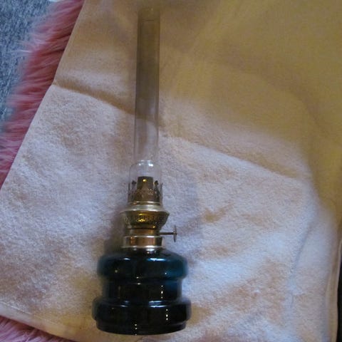 Pen mindre parafinlampe i keramikk med brennerglass og veke.