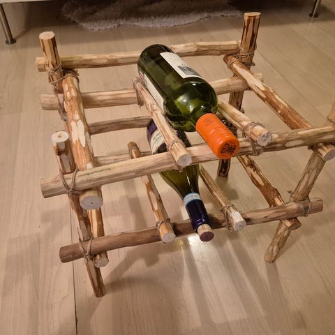 Vegghengt vinholder laget av eikeplate, med dekorative vinylplater. Holder to vinflasker horisontalt. Passer godt som interiørdetalj i stue, kjøkken eller hjemmekino.