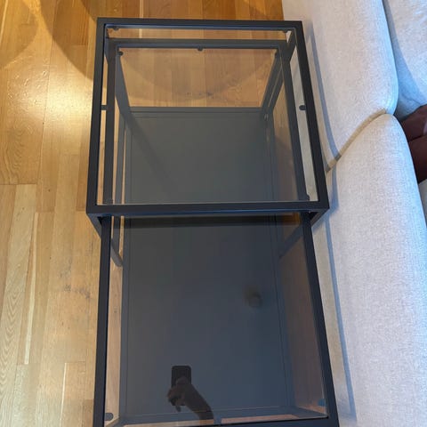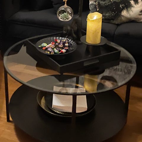 IKEA VITTSJÖ sofabord med svart glassplate og svart ramme. Bordet har en rund form med to nivåer, hvorav det nederste nivået er laget av svart materiale. Passer til bruk i stue eller oppholdsrom.