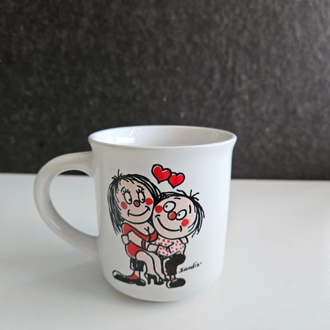 Ca 12 cm høyt, ca 9 cm på toppen - hank. Noen svake krakeleringer utenpå, noen bruksspor inni. Sender gjerne med posten