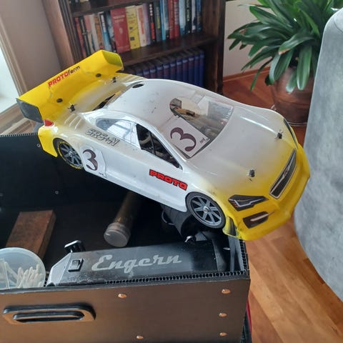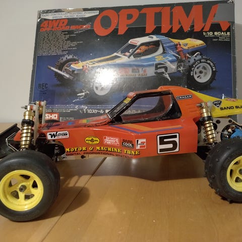 Selger en sjelden vintage Kyosho lazer 2000 med en Futaba FP-T 8 JN radio fra sent 80tallet tidlig 90 tallet. Kyosho lazer 2000 kom ut i 1999 og er en 1/10 skala 4- hjulstrekk buggy. Elektronikken i bilen er oppdatert med tamiya 540 mabuchi børstet motor og en tamiya tble-02s esc. Bilen har ikke noe olje i demperene og lekker litt, men dette er noe som lett kan fikses. Det kommer også med en ekstra antenne og det gamle spur giret( Dette har blitt byttet).