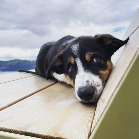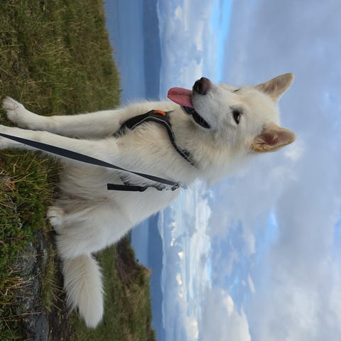 Er gjerne med på lange turer men klarer også å ligge stille hele dagen.