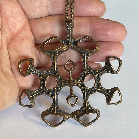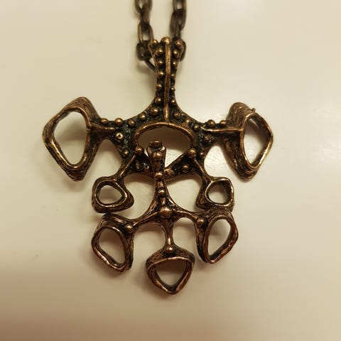 Utrolig kult halskjede i bronsje laget av Studio E&B of Norway. Total lengde 33 cm, selve anhenget er ca. 7 cm.