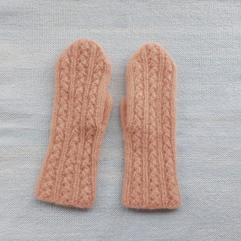 Håndstrikkede votter som knapt er brukt. Medium tykkelse, passer hånd S/M. Usikker på garn men er 100% ull.