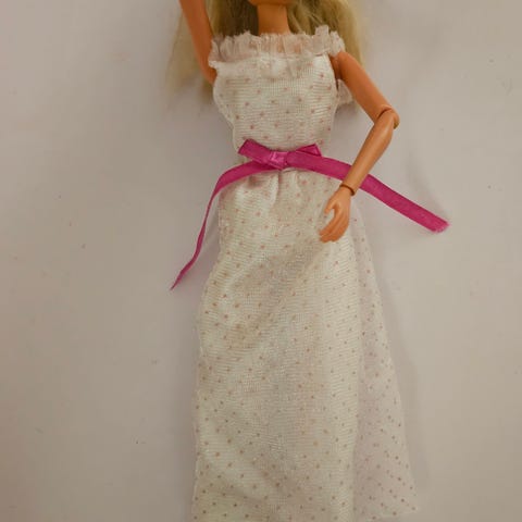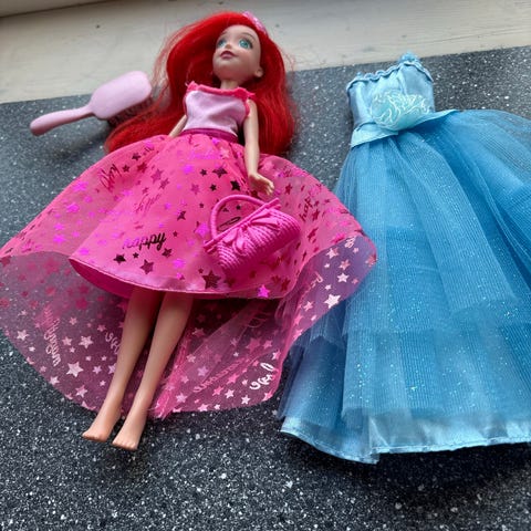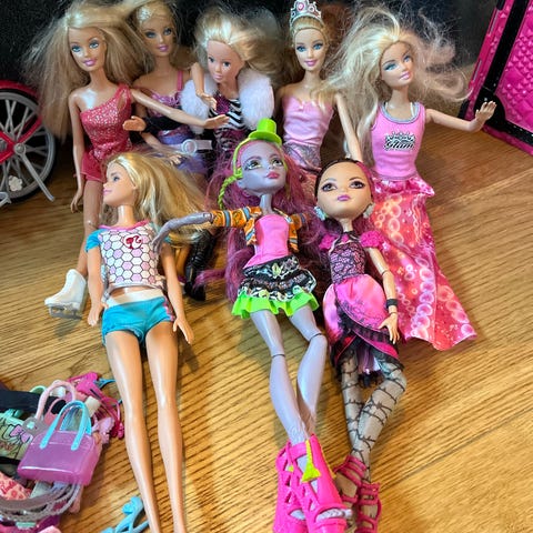 Barbie assortert dukker og klær. Inkluderer flere Barbie-dukker i ulike størrelser og antrekk, samt ekstra klær i forskjellige farger og stiler. Passer for barn som liker å leke med dukker og klær.