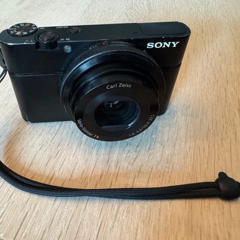 Sony RX100 kompaktkamera i svart farge. Kameraet har en kompakt størrelse som gjør det enkelt å ta med seg. Egnet for fotografering i ulike situasjoner med brukervennlige kontroller og justerbar skjerm.