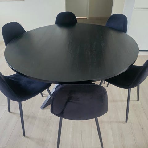 En pent brukt spisegruppe i eik, selges med 6 stoler og 1 forlenger på ene siden. Det gjør at det fint kan sitte 10 pers rundt bordet.