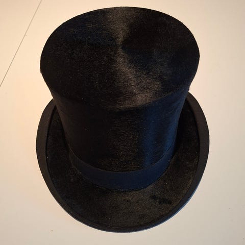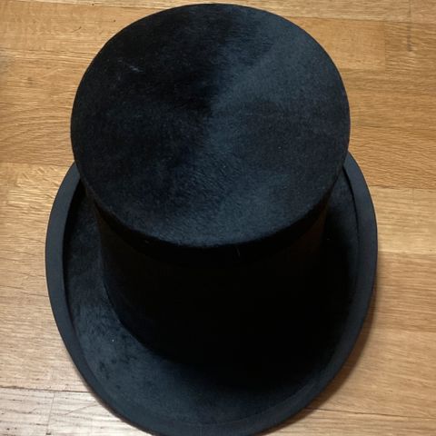 Flosshatt med original eske. Ca 55-56 cm innvendig mål. Sannsynligvis over 100 år, men kan ikke garantere det. Hatten er i god stand. Perfekt til 17.mai-toget eller til en tryllekunstner.