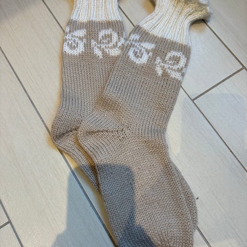 Nystrikkede, herlige kosesokker str. 38 strikket i Viking sportsragg selges for 200,-kr.