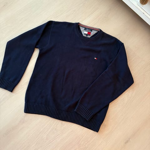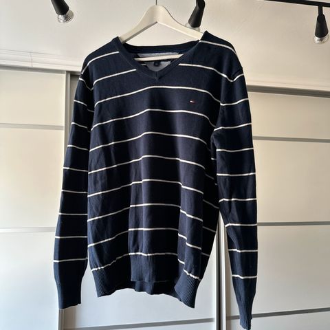 Tommy Hilfiger genser i størrelse XL, laget av bomull. Genseren er grå og har V-hals. Den er designet for menn.