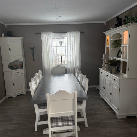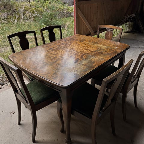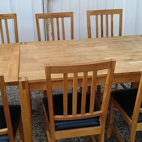 Spisestue i eik. Et bord med tre ileggsplater, seks stoler og to sjenker.