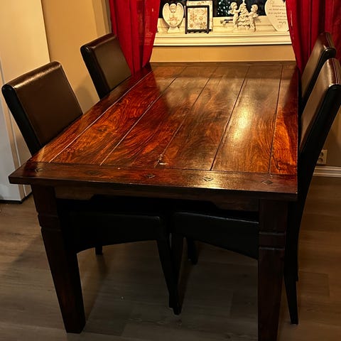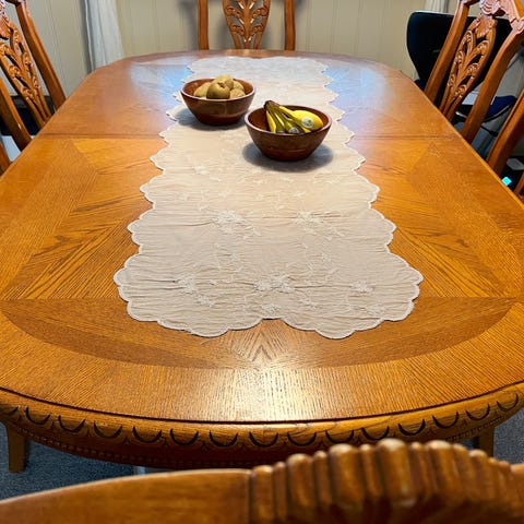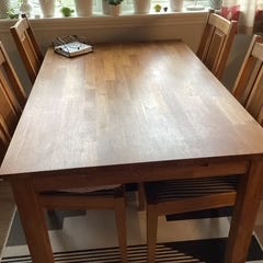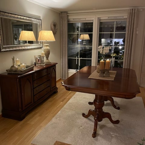 Bord : Lengde 114 cm, 240 cm med tre ileggsplater.