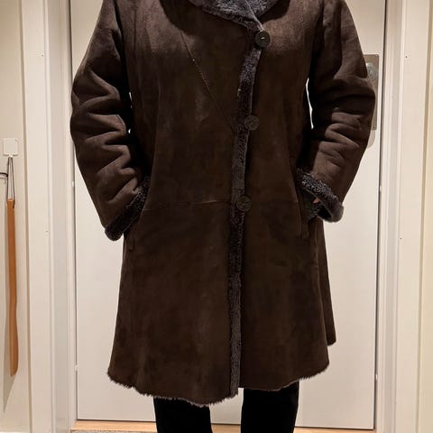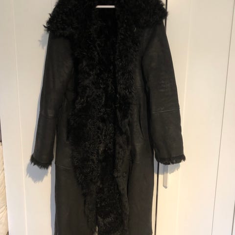 Klassisk og tidløs lang kåpe som er vendbar og kan brukes på begge sider. Glatt skinn på ene siden og «pels» på den andre. Se vedlagte bilder. Kåpen lukkes med knepping i front. Sidelommer i front og høy splitt i begge sider.