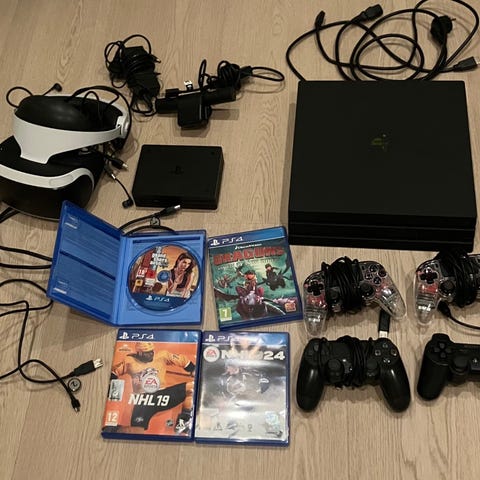 Selger en komplett og velholdt PlayStation 4-pakke med Sony VR-briller, mange kontrollere, spill og tilbehør. Perfekt for familie, barn/ungdom eller VR-interesserte 🎮