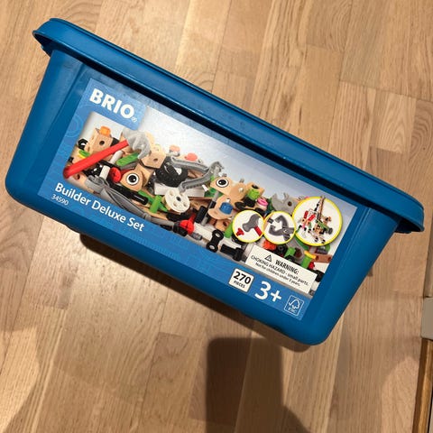 BRIO konstruksjonsleker sett med ulike deler i flere farger, inkludert plater, hjul, skruer og andre komponenter for bygging og konstruksjon.