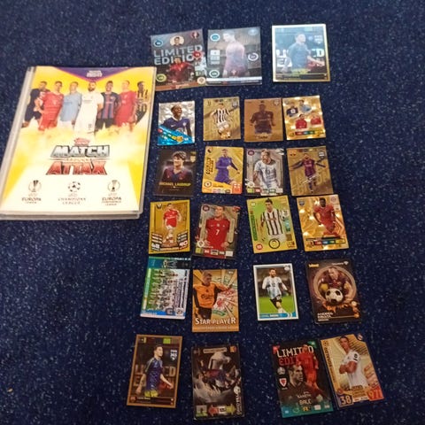 Match Attax samlekort og album med fotballtema. Inneholder kort med ulike fotballspillere og lag, lagret i et album med plastlommer for oppbevaring. Passer for samlere og fotballinteresserte.