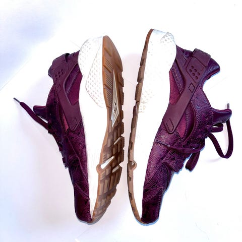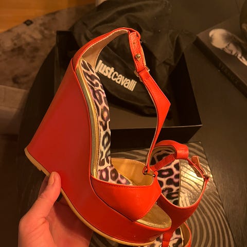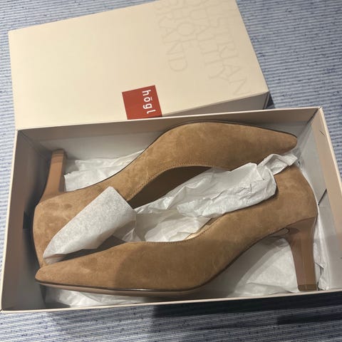 Skoene har en spiss tå og høy hæl. Glidelås på innsiden. Kun brukt en gang.