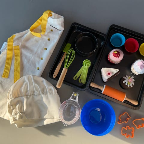 Bakermester Harepus i Hakkebakkeskogen sitt bakesett. Alt er ubrukt utenom kjevlen. Fint bakesett i god kvalitet. Flott stor metallkoffert som alt kan oppbevares i.