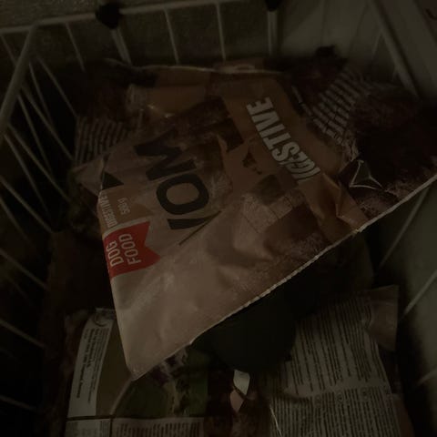 Hunden vår er ikke interessert i dette fòret lenger. Det r ca. 2/3 igjen av pakken.
