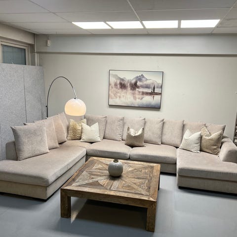Dette er en veldig komfortabel sofa som dessverre ikke passer inn i stuen i nytt hjem. Den er i fargen antrasitt og har velourstoff. Den er i varianten med faste ryggputer slik at du slipper å «fluffe» disse. Putene er i skum. Den har de to bruksmerkene som er avbildet, og er ellers veldig pen. Dybden på hjørnedelen er 245 cm, mens dybden på sjeselongdelen er 155 cm.