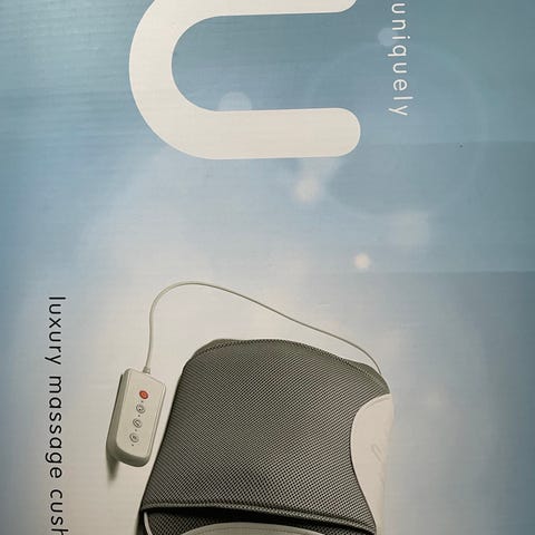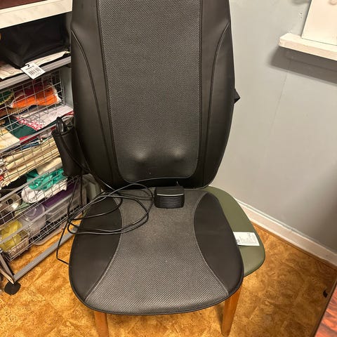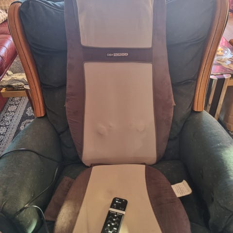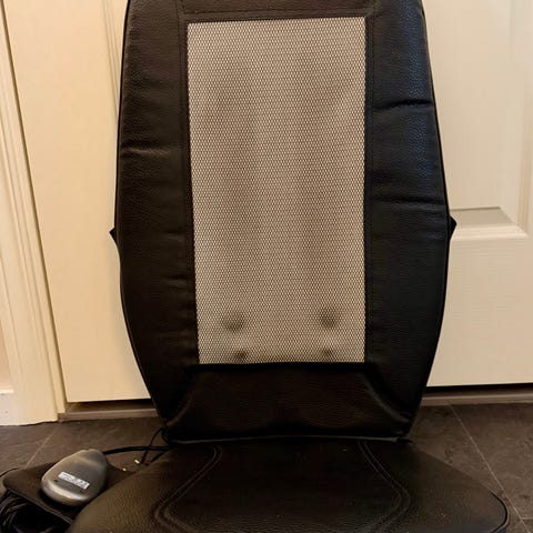 Massasjepute til stol med svart polstring, inkludert fjernkontroll for styring av massasjefunksjoner. Materialet kombinerer myk polstring og pustende netting for komfort under bruk.