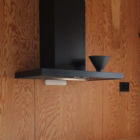 Skapene er hvite med klassiske fronter og solide håndtak. Over vinduet er det en heltre hylle/plate med integrerte spotter som gir behagelig og praktisk belysning. Vinduet rammes inn av matchende treverk som gir et varmt og gjennomført uttrykk.