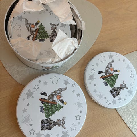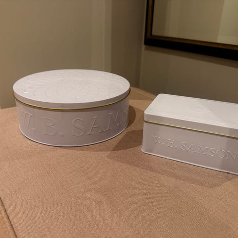 W.B.Samson kakebokser i metall, hvit farge utenpå, gullfarget inni. Boksene har dekorative mønstre på lokk og sider. Egnet for oppbevaring av kaker - eller andre ting.