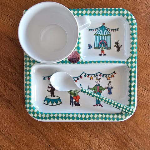 Pent brukt melanin barnesett/ barneservice fra Teddykompaniet selges. Settet består av flat asjett, dyp tallerken og kopp. Selger i tillegg bordbrikke/ bordskåner med samme mønster. Selges samlet.