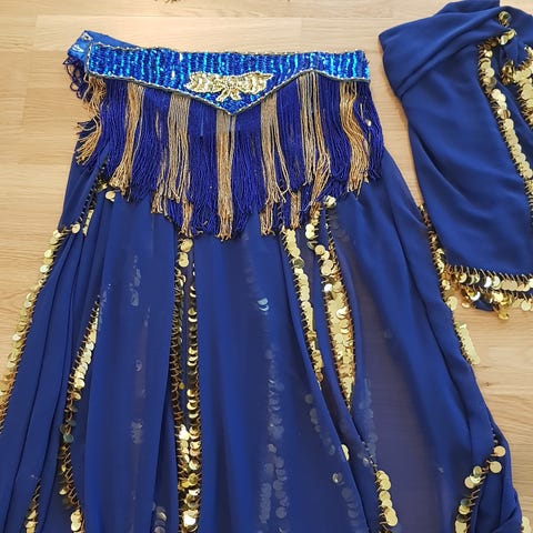 Vakkert og detaljert magedans-kostyme rikt dekorert med gullfargede perler, paljetter og mynter.