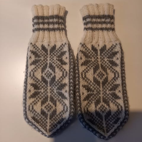 Lett tovede votter strikket i Rauma finull. Har disse to parene. Passer til middels stor dame- og liten herrehånd.
