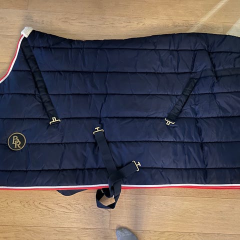 Revenge hesteteppe/ylldekken i navy blå med røde kanter.
