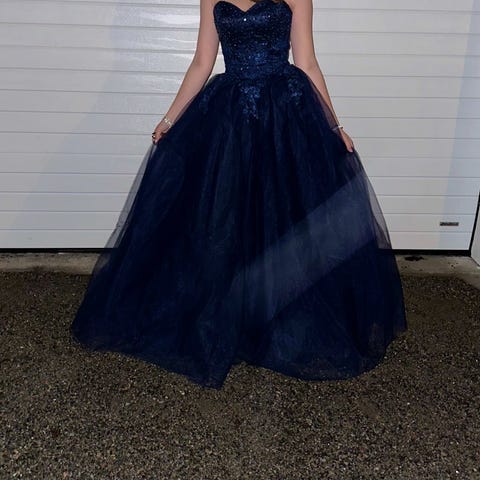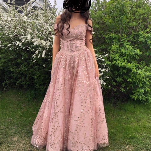 Lys blå «Askepott» kjole fra Tina Ritzi i Drammen, str M, selges kr 3800. Brukt 1 gang på ball. Det medfølger underskjørt. Kjolen er tilpasset ei som er 160 høy og med heler på skoene. Kjolen har snøring i rygg. Jenta som har brukt den er egentlig en str S men str M passet henne fint.