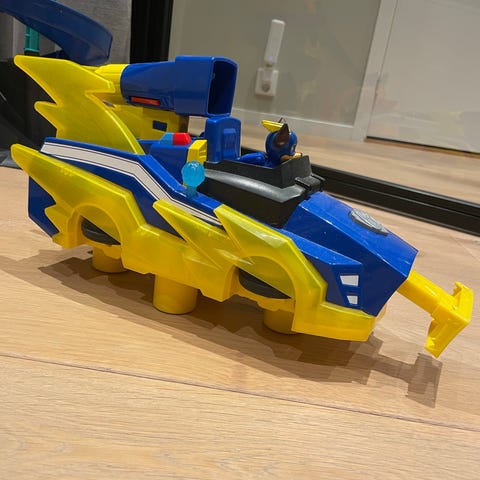 Paw Patrol mighty pups pakke som inkluderer flere kjøretøy og figurer fra serien. Den ene figuren fra den store bilen er borte, men ellers er alt i god stand.