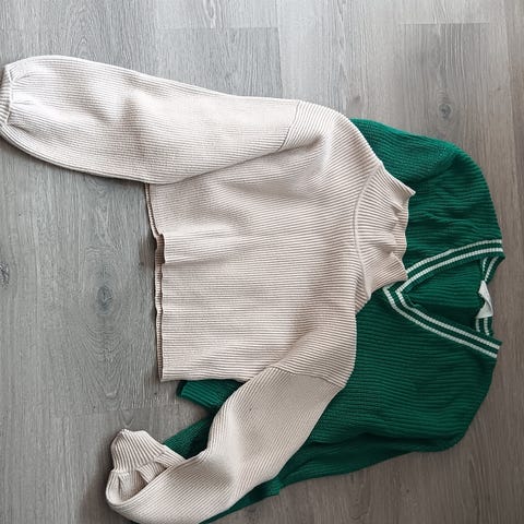Tre fine gensere rimelig til salgs. Ingen hull. Hele, rene og pene plagg bortsett fra den stripene blå og hvite som har en 2-3 mm grå flekk på magen ( kan være blekk. Gikk ikke av i vanlig vask).