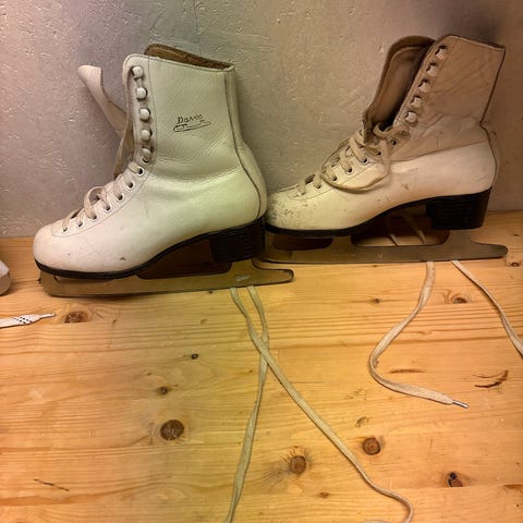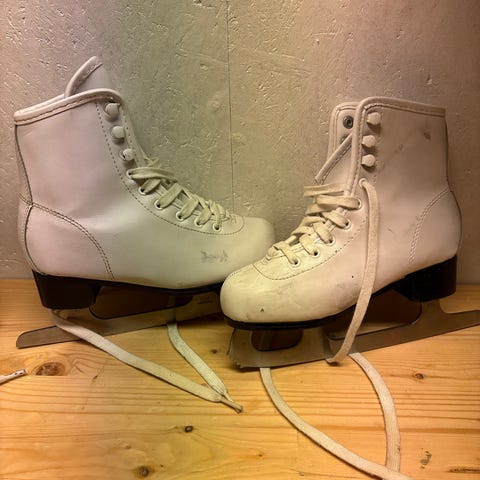 Hvite barneskøyter i størrelse 34, egnet for andre skøytesporter. Skøytene har snøring og en klassisk design.
