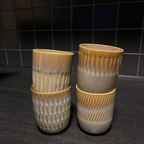 Cuisine kopp i grå keramikk. Fire kopper med hank, egnet for varme drikker. Enkel og funksjonell design. Ingen merker.