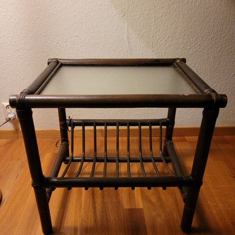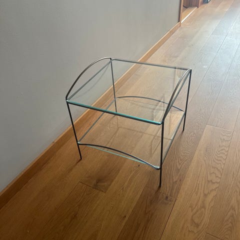 Sidebord på hjul med glassplate og hylle. Ingen synlige merker.