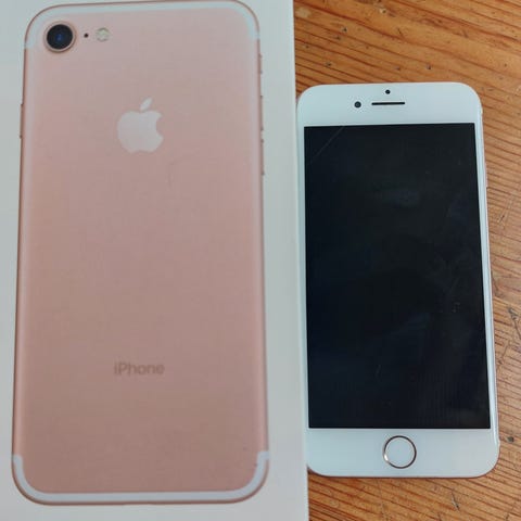 Apple iPhone 7 mobiltelefon med 32 GB lagringskapasitet. Enheten har en svart farge og en skjerm med synlige riper og skader. Telefonen er designet for personlig bruk.