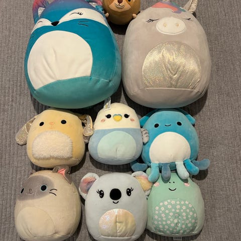 Squishmallows myke kosedyr i forskjellige størrelser og farger. Laget av mykt materiale, egnet for barn.