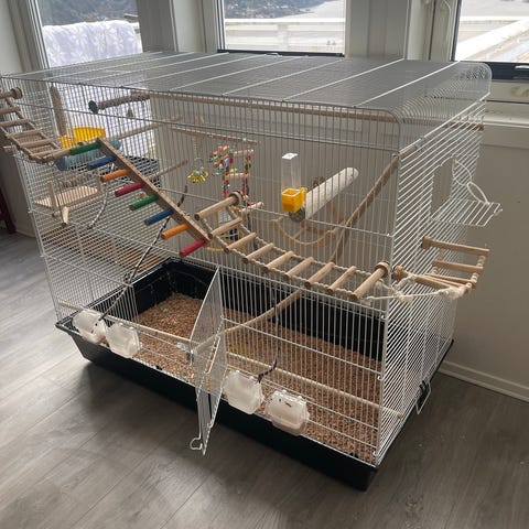 Kjempe greit bur til fugler . Følger med masse utstyr . Greit å gjøre rent . Har hjul så lette å flytte .må hentes hos selger . Trekk til å legge ned så fuglene for fred på kvelden .