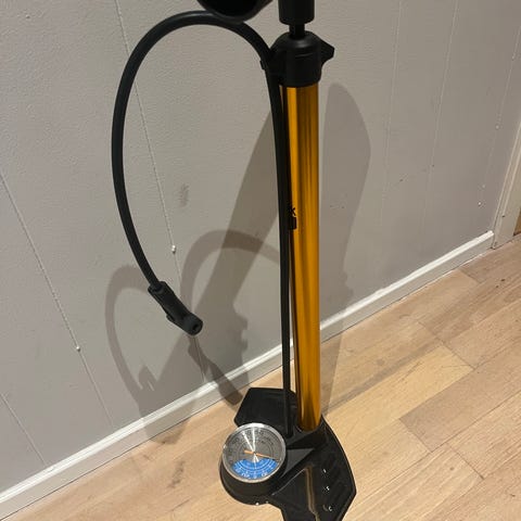 SKS Air-X-Press sykkelpumpe med innebygd trykkmåler. Pumpe i svart og oransje med håndtak og fotstøtte for stabil bruk. Egnet for sykler, gir enkel oppblåsing og nøyaktig trykkavlesning.