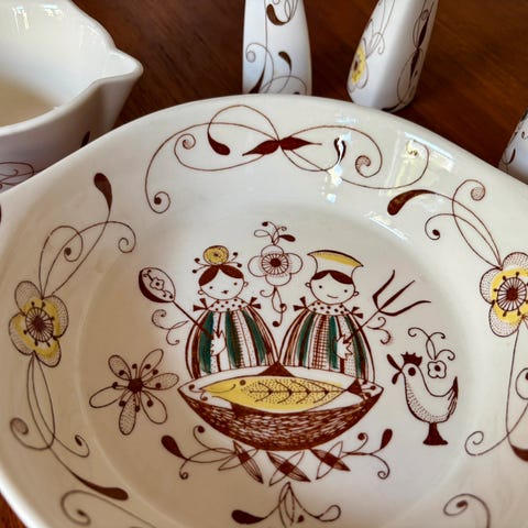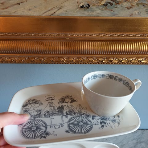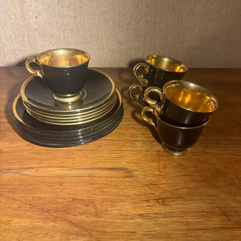 1 kopp og 2 skål. Skåler m eit lite skår i, men f eks som pyntegjenstander synes det ikkje vil eg sei🙂 kan sendes, pakker super godt inn.c porto kr 69,-