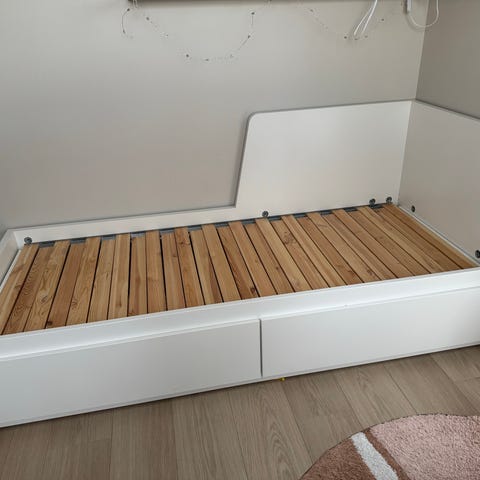 Brimnes dagseng fra IKEA selges til en billig pris da den må demonteres av kjøper. Kommer med to madrasser. Denne senga har stått til pynt på et barnerom og vært brukt maks 5 ganger.