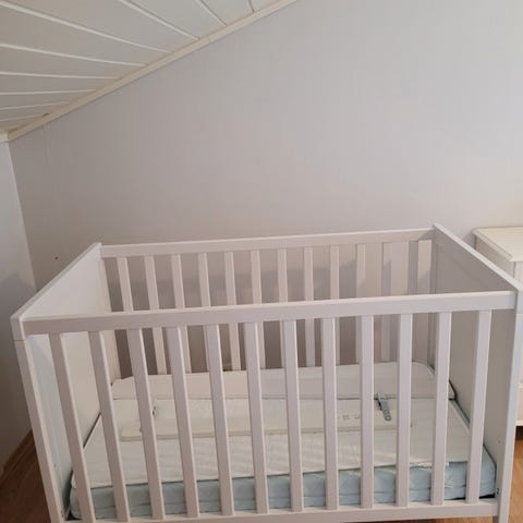 60×120 cm. Har stått hos mormor. Svært pent og lite brukt. Madrass kan følge med utan ekstra kostnad.