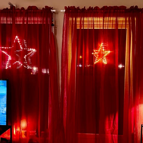 2 lengder røde julegardiner fra Kid selges samlet kr. 100,-.